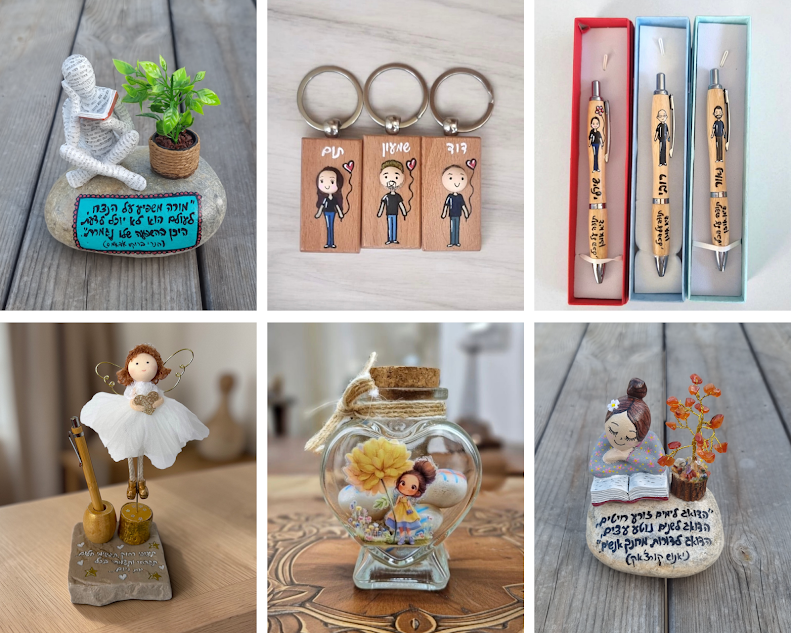 - מתנות ועיצוב אישי: מתנות לסוף שנה, עטים מעוצבים, מחזיקי מפתחות , אבני ברכה למורים וארגוניות שולחן מחומרים טבעיים.
