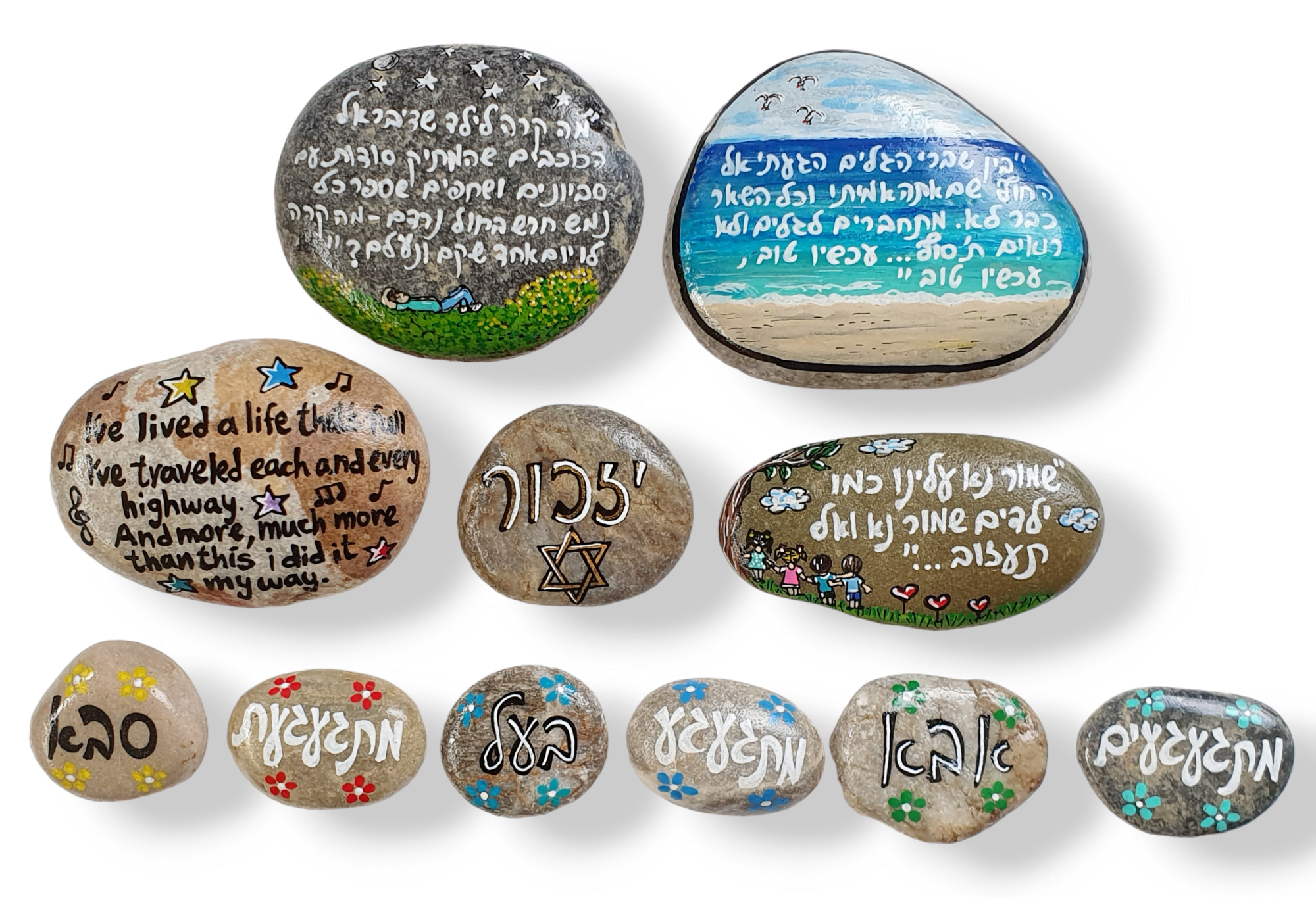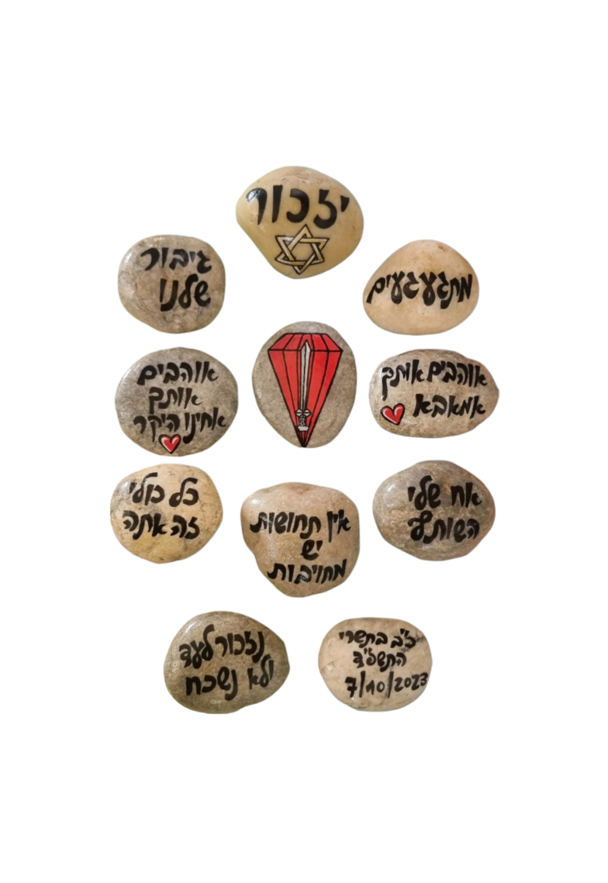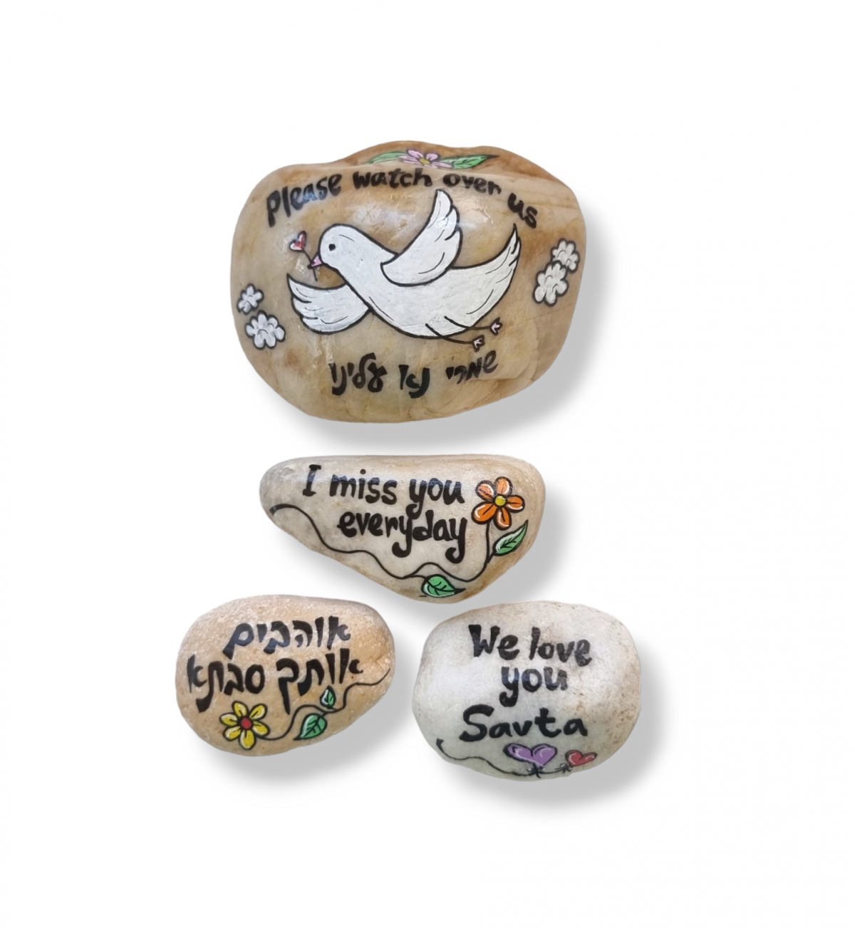 אבן זיכרון עם כיתוב אישי, מצוירת ונכתבת בעבודת יד על אבן טבעית. כל אבן נוצרת בהשקעה רבה וכוללת מלל מרגש בשילוב איור עדין לפי הצורך, והופכת למזכרת הנצחה אישית, ייחודית וחד-פעמית.