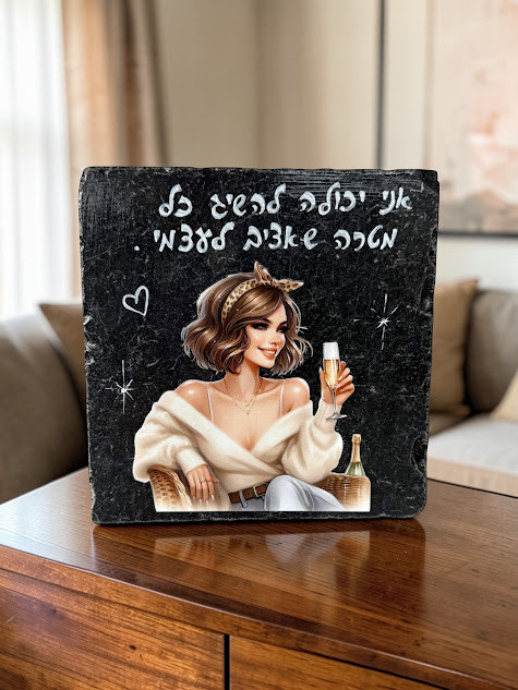 השילוב המושלם בין החוזק והעוצמה של אבן השיש לבין עדינות המילה הכתובה. יצירה ייחודית מהסטודיו שלי, המשלבת הדפס נשי מודרני עם כתיבה אמנותית בעבודת יד, שנועדה להזכיר לכל אישה את הכוחות הטמונים בה.