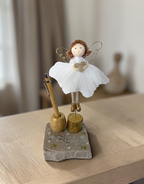 פסלון פיה עם עט לשולחן עבודה הוא מתנה מקורית שמוסיפה לשולחן העבודה נגיעה של קסם והשראה. הפיה משלבת מחזיק עט מעץ עם בסיס אבן טבעית ועליו משפט השראה.